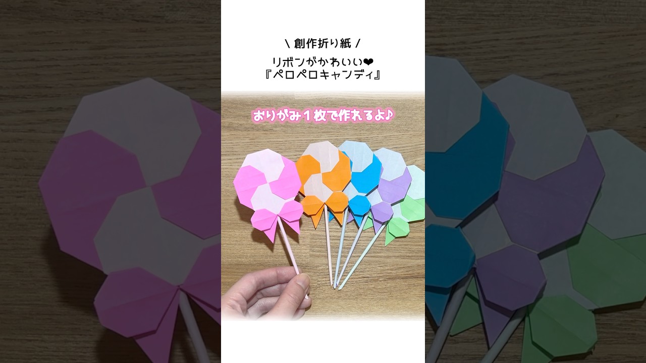 タイトル【折り紙1枚】リボンが可愛い 『ペロペロキャンディ』 ※詳しい作り方はYouTube本編から♪ #折り紙 #キャンディ #ハロウィン #お菓子 #origami #candy #shorts